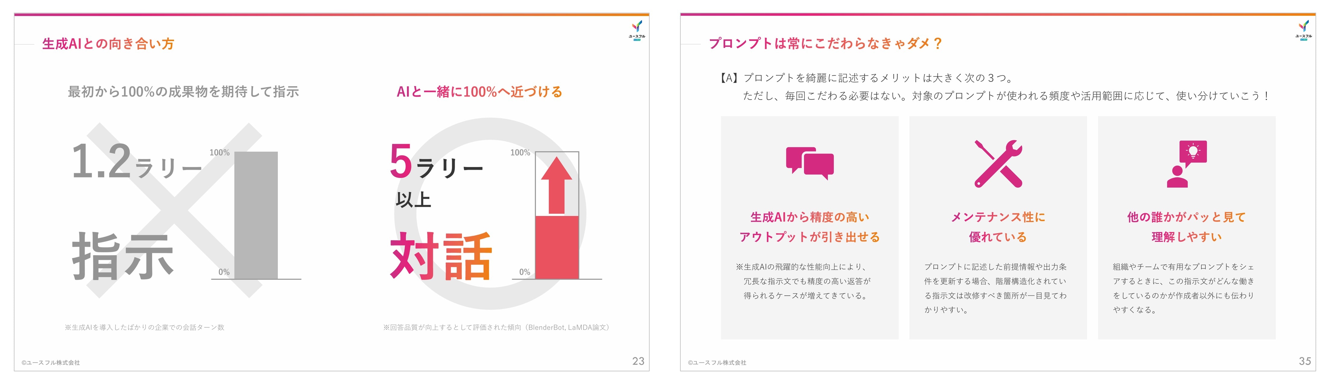 ニーズの高いテーマであることはもちろん、前述したインタラクティブ性やアフターフォローのおかげで、ユースフルの講座は毎回100名超がエントリーする人気セミナーとなっています。特に生成AIについては技術の進化も激しく、世の中で働く人々が求めるトピックが常に変わり続ける領域です。多様なテーマでカリキュラムやワークを企画でき、満足度の高い空間を演出し続けてくれるユースフルとともに、参加者の明日の働き方が変わる感動体験をお届けして参ります。